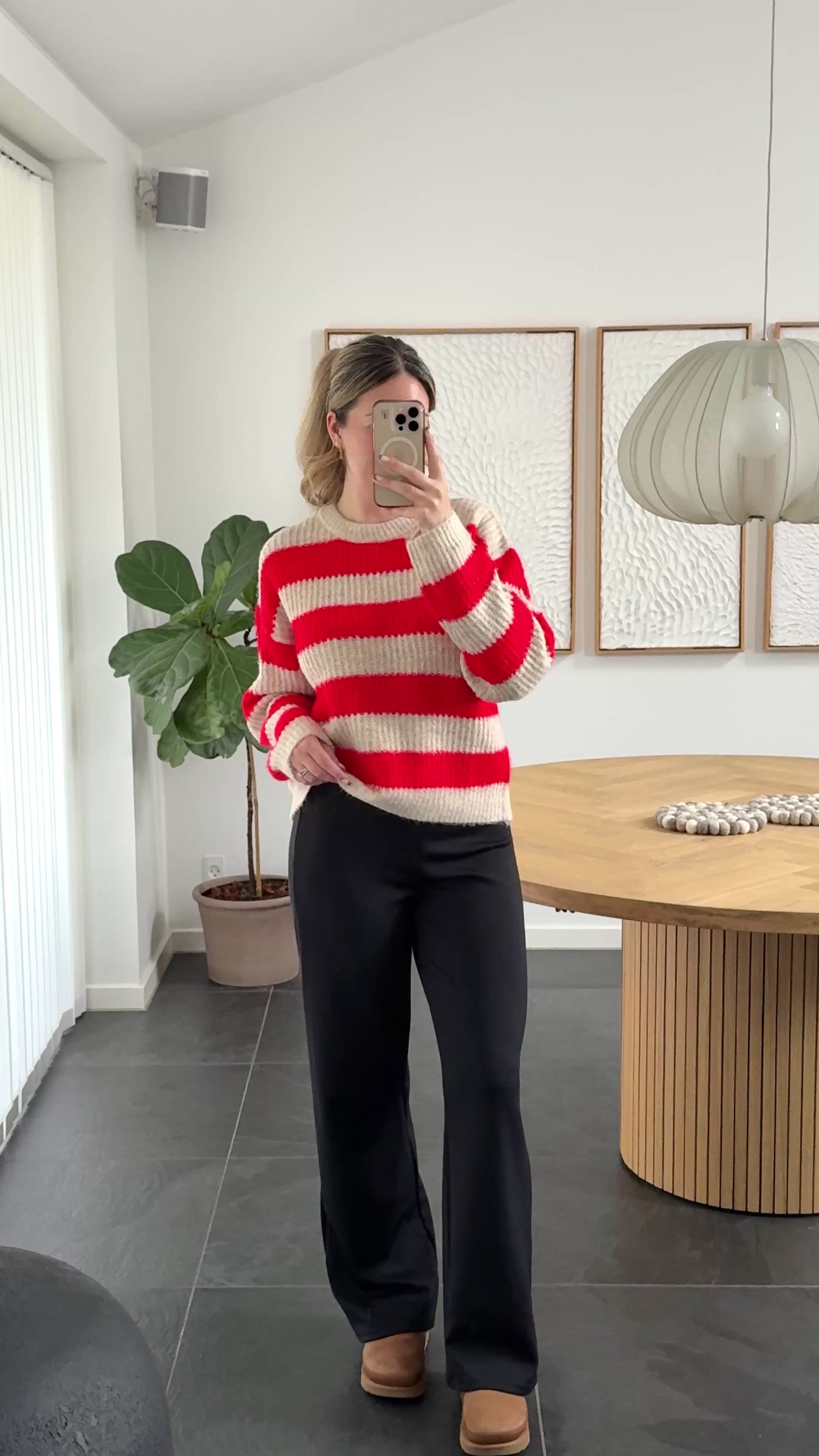 Blød strik fra Liberte med større striber i farverne rød og beige. Strikken har rund hals og lange ærmer. Den har en smule løs pasform.