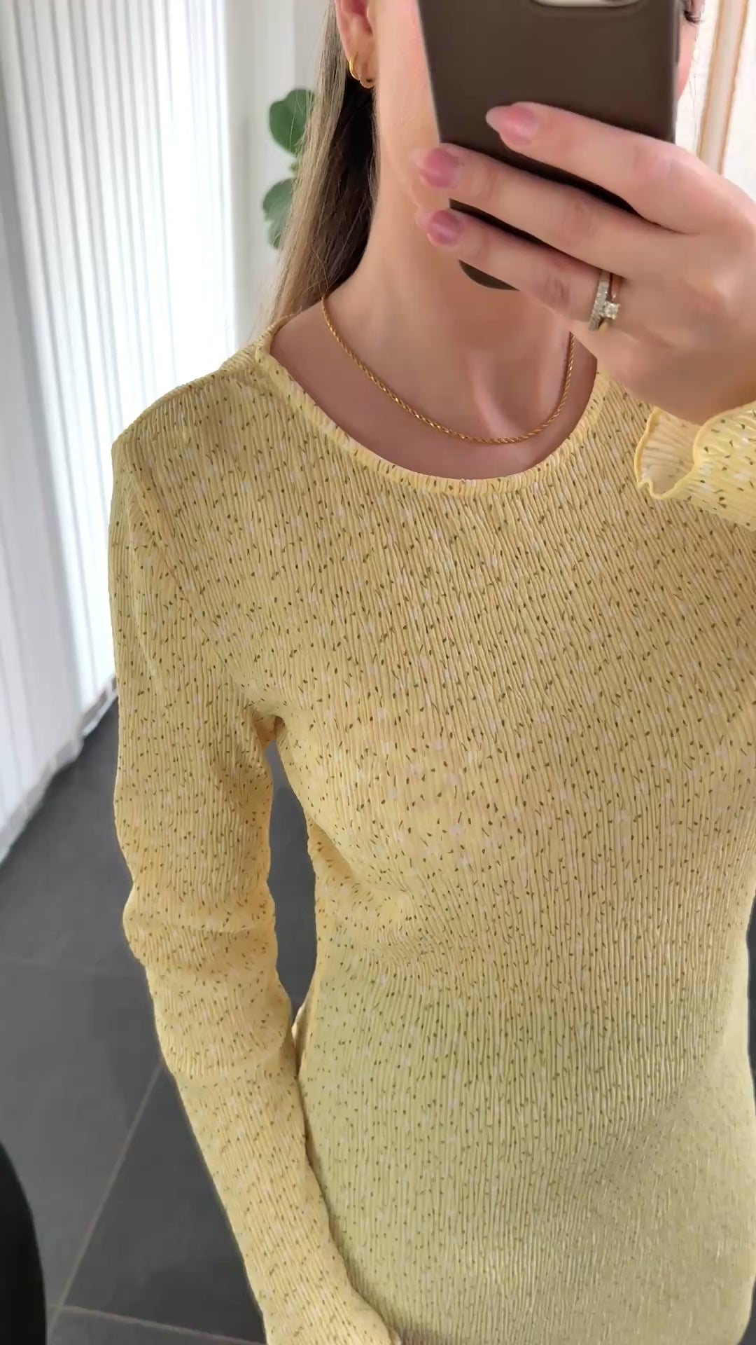 Smuk plisseret kjole i gul med små hvide blomster. Der er slids i den ene side, rund hals og lange fine ærmer. Style den med et par fede sneakers eller en fin stilet. Kjolen er ideal til både hverdag eller festlige begivenheder.