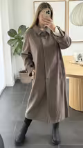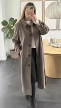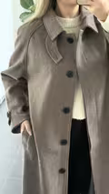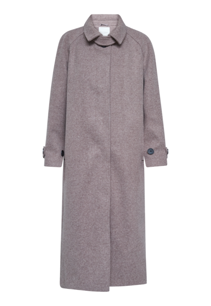 Smuk lang og tidløs frakke fra Sisters Point i farven brown mel. Frakken har knaplukning og to lommer foran. Rund hals med klassisk krave, og en ekstra detalje som kan tages helt af.