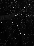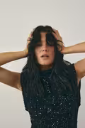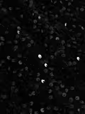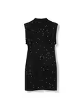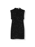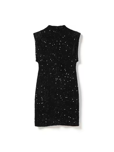 Kort sort glimmer kjole med høj hals og skulderpudder. Den er tætsiddende i underdelen og lukkes med en lynlås bagpå.
