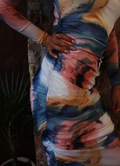 Lang kjole fra Liberté i de fineste farver, blue peach gold marble. Den har lange ærmer og falder smukt med dens rynke effekt.
